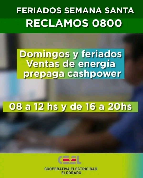 Eldorado Información General Eldorado_ La Ceel tendra atencion en 0800 y guardias pasivas. 5 de abril de 20234 de julio de 2023 Marcelo 442 visitas 0 Comments Ceel semana santa, Eldorado, Misiones 0 minutos de lectura Comparte y Divulga !!!Eldorado/Semana Santa: La Ceel tendra atencion en 0800 y guardias pasivas. A traves del area correspondiente se dio a conocer los horarios y numeros útiles en casos de emergencias en esta semana Santa. Comparte y Divulga !!!